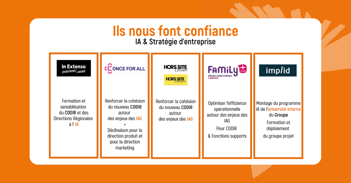 Nos expert IA sont intervenus auprès de nombreux CODIR pour mettre en place une stratégie IA et accompagner nos clients, pour faire évoluer leur offre et leur business model.
