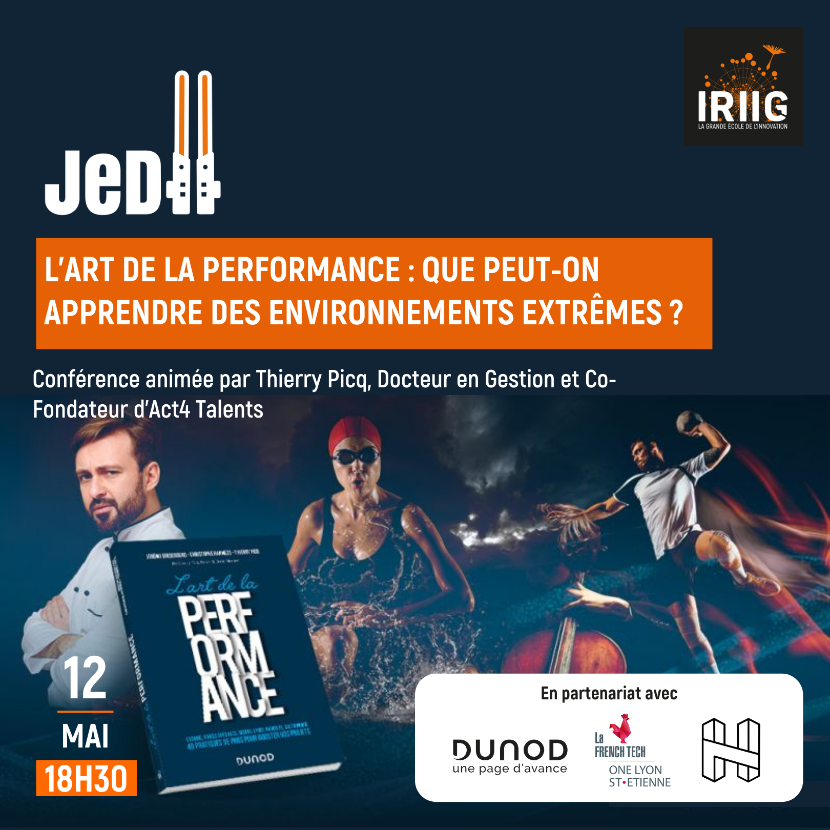 Jeudi 12 mai IRIIG organise une nouvelle conférence JeDII. Nous serons ravis de vous accueillir au H7, à Lyon Confluence pour participer à la conférence « L’art de la performance : que peut-on apprendre des environnements extrêmes ? » animée par Thierry Picq, Docteur en Gestion et Co-Fondateur d'Act4 Talents.